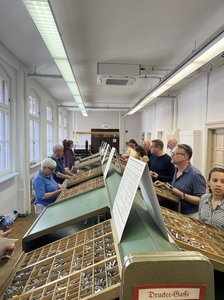 Die liebe Julia Rinck von der Buntpapiersammlung im Buch- und Schriftmuseum präsentierte uns einige der dort vorhandenen Schätze. Beim Aufschlagen der ersten Mappe ging ein Raunen, ein »Aaah!« und »Oooh!« durch die Reihen der Umstehenden (Zitat Frau Rinck: »Richtige Reaktion! Jetzt weiß ich, dass ich ein 'gutes Publikum' habe, und habe richtig Spaß!«). Es zeigten sich wunderschöne Brokatpapiere, Kleisterpapiere (auch japanische), Modeldruckpapiere, Künstlerpapiere (unter anderem von Lilli Behrens), Marmorpapiere und mehr aus den vergangenen Jahrhunderten – welch' eine Farbenpracht! Nachdem wir noch flugs einige Photos von der ausliegenden Sekundärliteratur geknipst hatten, ging es schon fast im Laufschritt weiter: