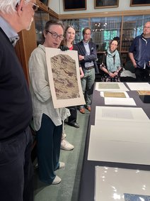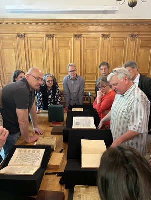 Ohne unsere Köpfe kurz geraderücken oder das soeben Gehörte wirklich verinnerlichen zu können, ging es weiter in einen getäfelten Raum im Erdgeschoss, wo Prof. Dr. Thomas Fuchs, Leiter der Sondersammlungen der Albertina, und sein Mitarbeiter uns noch mehr Schätze präsentierten. Wir sahen etwa eine Ausgabe der berühmten Polyglotte aus dem frühen 16. Jahrhundert – ein Meisterwerk der Setzkunst, enthält sie doch neben dem kompletten Text der Vulgata parallel die entsprechenden Texte auf Griechisch (mit zusätzlicher lateinischer Übersetzung), Aramäisch und Hebräisch. Interessant fand ich persönlich einen Leipziger »Studentendruck«, bei welchem ein Werk von Aristoteles so gesetzt und gebunden war, dass die Studiosi ihre handschriftlichen Notizen direkt im Buch ergänzen konnten. Beeindruckend waren auch ein ausgesprochen gut erhaltener Gobelin-Einband, (wieder) ein Tafelwerk von Piranesi und, neben einigen Schriften Luthers, auch seltene Kleinschriften zur katholischen Auseinandersetzung mit der Reformation. Ach ja: und ein ganz besonderer Einblattdruck: ein nicht genutzter und dadurch erhalten gebliebener Petersablass ... so könnte ich noch länger weitermachen, aber es folgten ja noch andere Abenteuer, von denen es zu berichten gilt!