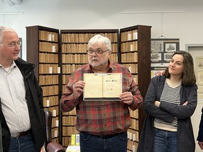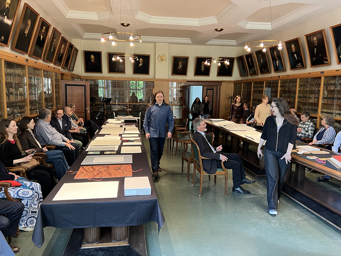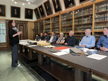 Empfangen wurden wir von Carola Staniek im historischen Sitzungszimmer – geziert mit etlichen Portraits und gesäumt von Vitrinen voller Bücher aus der Reichsbibliothek. Während der Begrüßungsansprache lagen bereits etliche Mappen auf den Tischen bereit, deren Deckel man nur zu gerne gelüftet hätte ... das passierte dann glücklicherweise kurz darauf.
