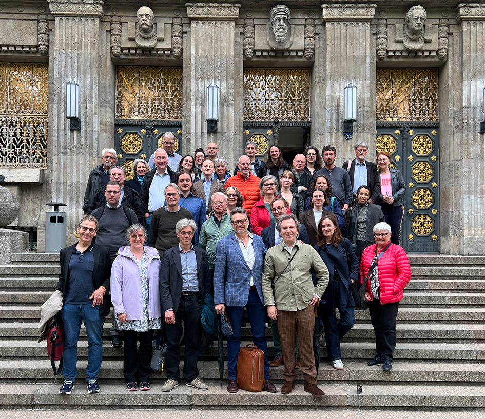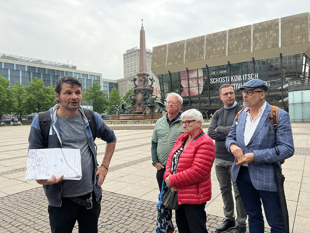 Nach einer kurzen oder längeren Mittagspause (je nach Gruppe) fand man sich am Mendebrunnen im Zentrum Leipzigs zusammen zur geplanten »literarischen« Stadtführung durch das Graphische Viertel: »Von Lettern und Eulen, Büchern und Gänsen«. Dass es ausgerechnet jetzt stärker regnen musste, war etwas schade (»perfect timing«), aber unser sympathischer Stadtführer Sebastian Ringel machte das allemal durch seine spannenden Anekdoten über Breitkopf & Härtel, Reclam, Brockhaus und wie sie alle hießen, wett. Somit war es trotz der Witterung ein Vergnügen, per pedes die Orte der historischen Verlags- und Druckgeschichte Leipzigs zu erkunden. Ein kurzes »Hop-on, Hop-off« mit der Straßenbahn beförderte uns einigermaßen trockenen Fußes zu einem weiteren launigen gemeinsamen Abendessen im »Volkshaus Leipzig«.